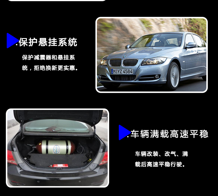 1、功能:解決由原車彈簧過度疲勞:和車子改燒天然氣后車身加重的情況下所引起的汽車尾部塌陷的問題 !。