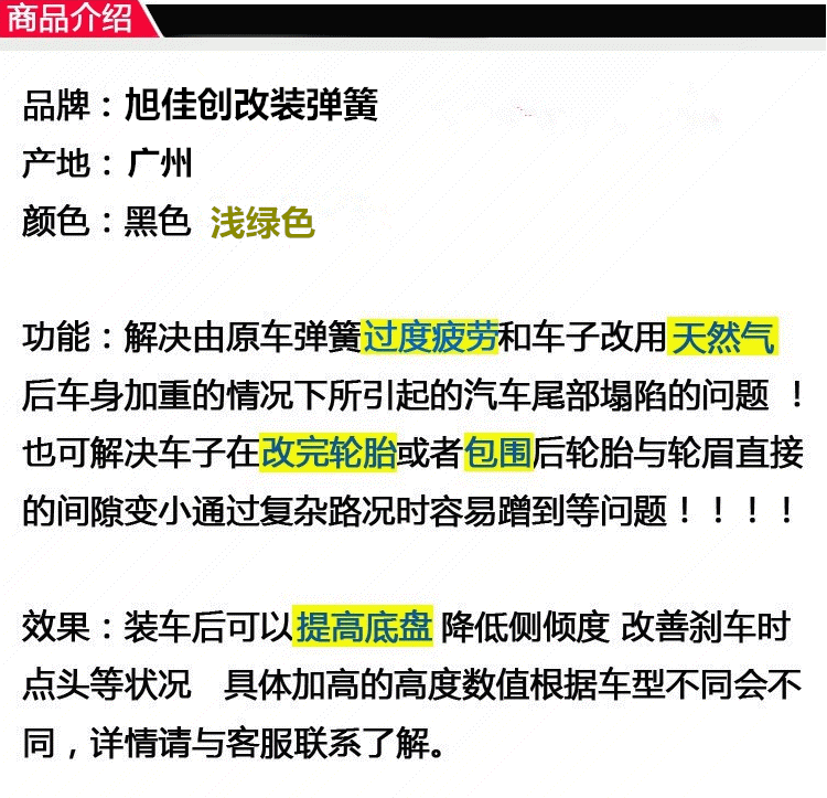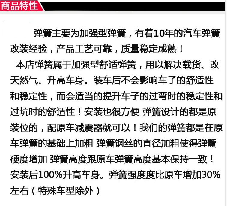 旭佳創(chuàng)彈簧主要是經(jīng)營加強型彈簧,以及一流的生產(chǎn)水平,和最真誠的服務(wù)。”镜陱椈蓪儆诩訌娦褪孢m彈簧,,裝車后不會影響車子的舒適性和穩(wěn)定性,而會適當(dāng)?shù)奶嵘囎拥倪^彎時的穩(wěn)定性和過坑時的舒適性!安裝也很方便 彈簧設(shè)計的都是原裝位的,配原車減震器就可以!可比原車多載重200公斤左右 。我們的彈簧都是在原車彈簧的基礎(chǔ)上加粗 彈簧鋼絲的直徑加粗使得彈簧硬度增加 彈簧高度跟原車彈簧高度基本保持一致!